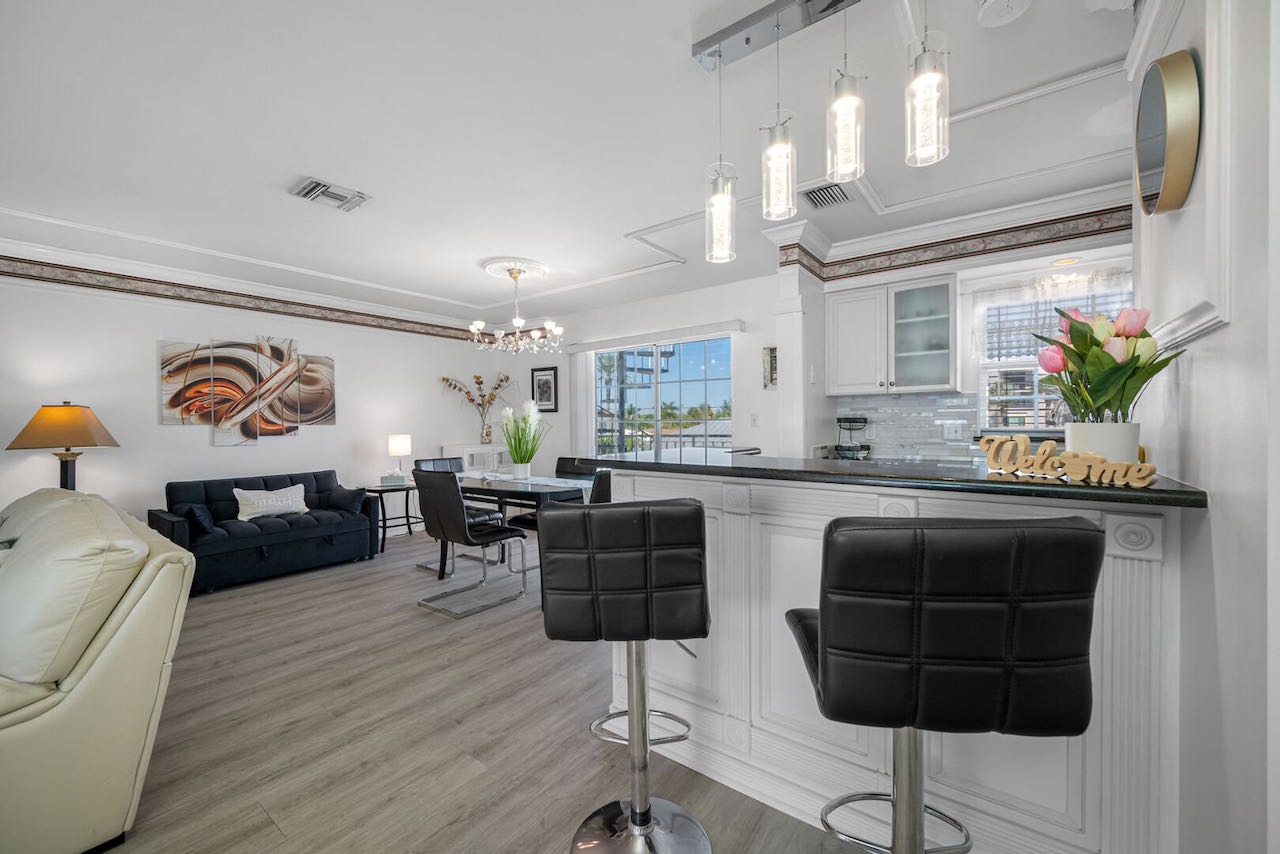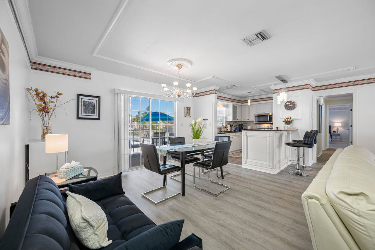 • living room  with a cozy oversized chair that converts to a single, dining table, chairs, flat 85″ screen cable TV